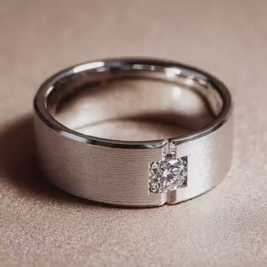 Designed for modern craftsmen like bar owners, this men's ring features a 0.5ct lab-grown diamond (IGI certified) set in textured white 18K gold. The wide band with vertical brushing evokes oak barrel aesthetics, while the prongs symbolize ice cubes. Comfort-fit interior ensures all-day wear. Water-resistant and hypoallergenic.